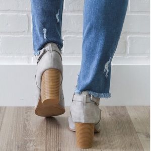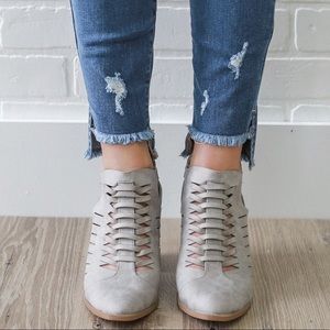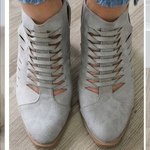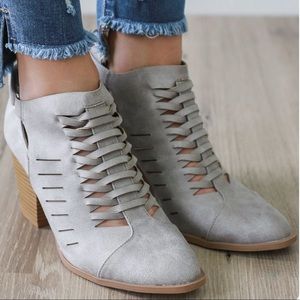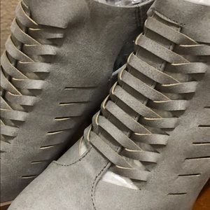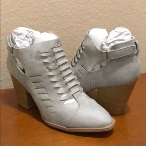 Made with faux leather upper in a distress finish, this almond toe ankle bootie set on a block stacked block heel features a woven design with hook and loop fastener for easy on an off fit. Heel: 3" approx. Fits true to size. Brand new never worn with shoebox. Color: Light Grey. Actual shoe photos provided.