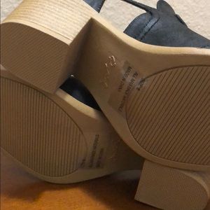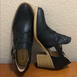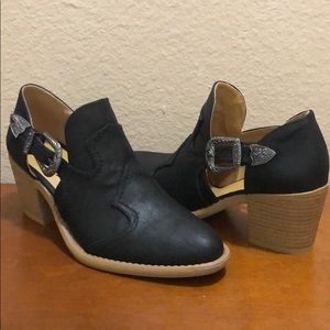 This boho-inspired bootie is made of distress leatherette upper in pointy toe profile detailed with stitch accents and designed with cut out side panels and decorative buckles *Heel: 2.5" approx * brand new never worn with shoebox* size 6 fits half a size big so perfect for 6.5