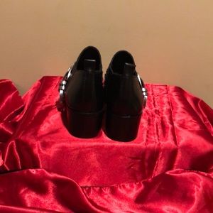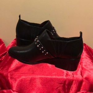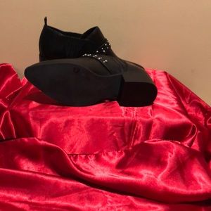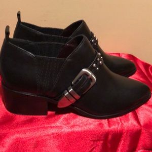 BCBGeneratin black leather, ankle top,1.75”heels,silver buckle ,cross strap with silver studs,7M pointed toes.