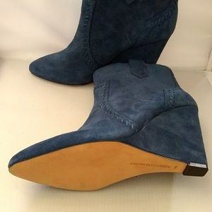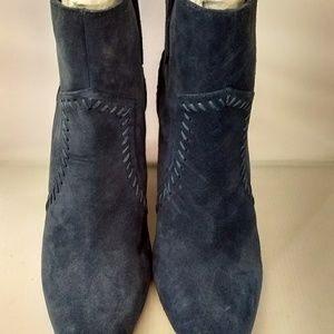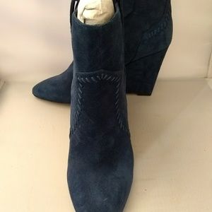 Midnight Blue Swede Leather Ankle Bootie. Fits true to size.
