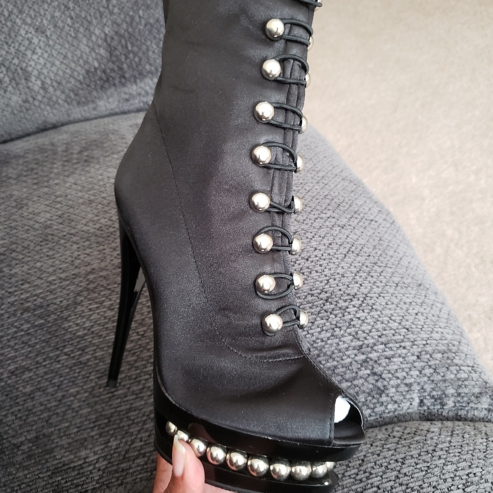 Black bootie with a stiletto heel! Very sexy fits your ankle like a glove. Never been worn..