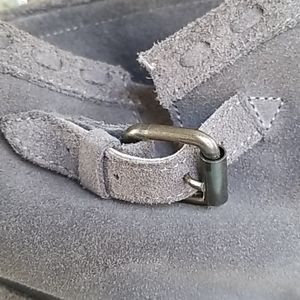 Excellent condition! Worn only a few times, dark grey suede. Pull on soft shaft. Dark gunmetal hardware. Buckle at ankle and top of boot adjustable. Accent stitching all around boot. Size 9