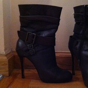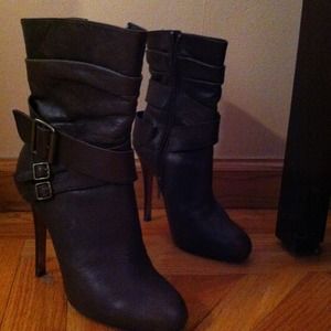 Beautiful brown leather booties! They're a little higher than your ankle. They go perfect with skinny jeans. They're 4.5 inch heels. The Ellisha from STEVEN by Steve Madden is a no-nonsense, sophisticated ankle boot with a timeless appeal. With its high heel and smooth leather upper, the Ellisha flatters a variety of styles, and the buckle accents impart a modern elegance. A sturdy man-made sole finishes things off, and helps keep you steady on your feet all day long.