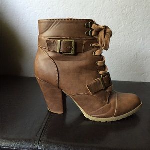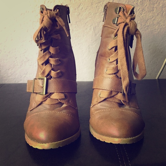 Brown booties, but one is missing the bottom of the heel. You can feel it when you are wearing it or you can't really tell if you are wearing it.