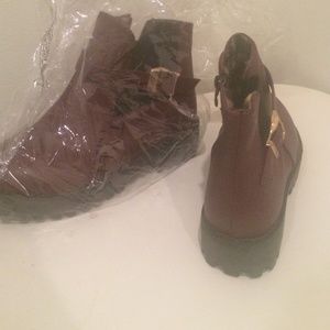 Burgundy colored ankle booties. Have a gold buckle on side and felt lining on inside. Never worn!