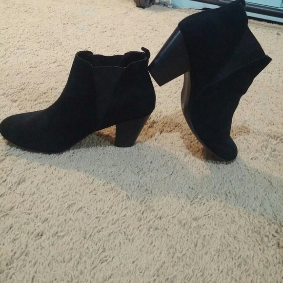 Black suede like material ankle booties. Never worn, ended up with 2 pairs somehow. Cute with skirts, dresses, skinny jeans and skirts.