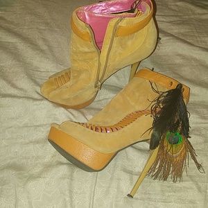 Tan booties with peacock feathers on the side