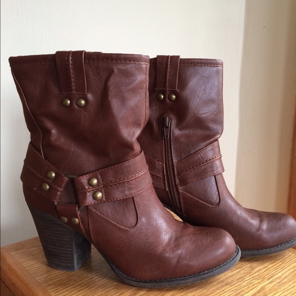 Brown fake leather boots with heal. Worn twice. Some small blemishes. Hardly noticeable, but price is adjusted accordingly.