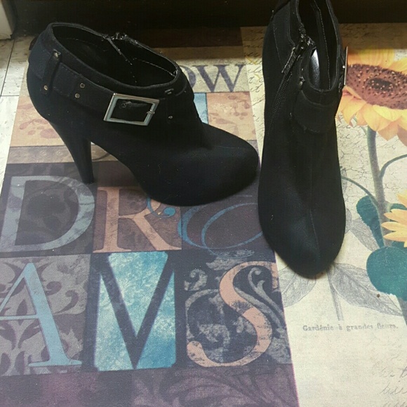 Black suede booties with silver buckle