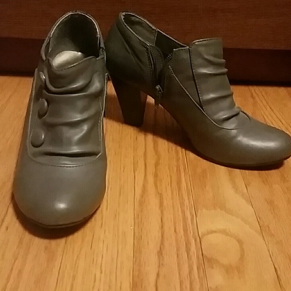 Lightly worn grey booties. Zipper is located on the instep. 3 decorative buttons on the side. Goes really well with a pair of dark wash skinny jeans!
