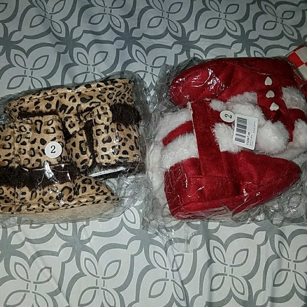 Booties i bought for my daughter never used. One is leopard print, other red with white.