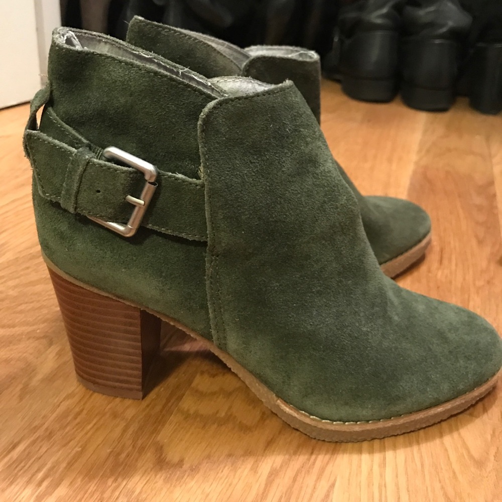 Evergreen suede booties, hardly worn. One has remnant of a foam padding stuck on insole