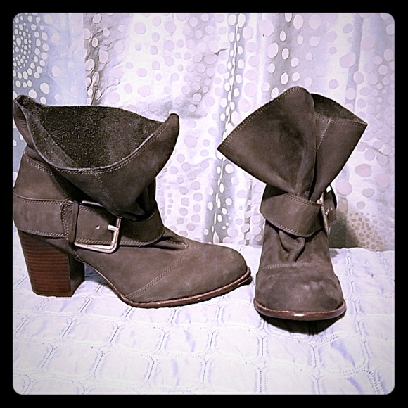 These gray leather booties are in like new condition. The color goes well with any outfit and the leather is cut so the tops flare out or can be folded to the side for a tidier look. Like new.