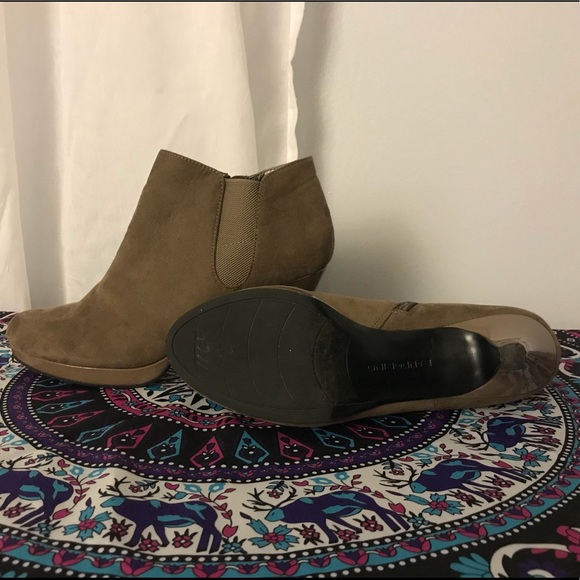 Suede booties, worn twice. Damage to each heel as noted in pictures.