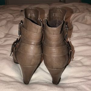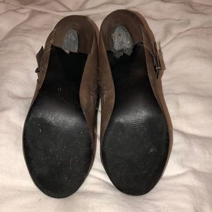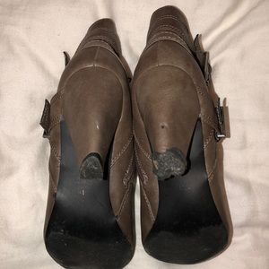 Short brown booties, super cute for church! One of the heel covers is gone (as shown in picture) but they’re still in good shape!