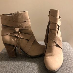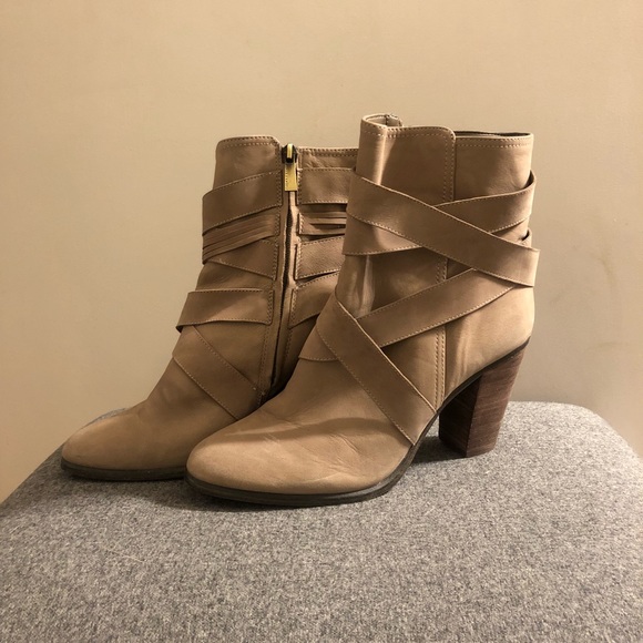Beige Vince Camuto booties with heel. Worn once or twice. A few tiny signs of wear. Shown in photos.