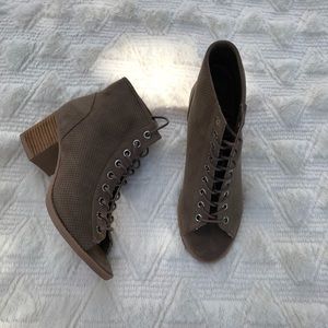 Open toe booties size 6.5 but these run pretty big and will fit a 7 even 7.5