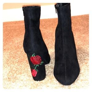These all black booties with flowers on the heel are perfect for a dinner date or out to the movies. Very comfortable.