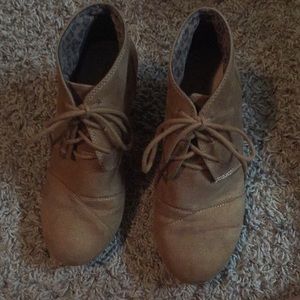 Super cute ankle booties with about a 2-inch heel. Easy slip on and tie with cheetah print on the interior. Minor wear from use. Size 7.5