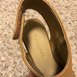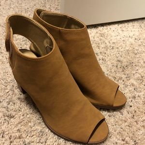 Taupe, open toed booties with Velcro back strap. Women’s size 7. Only worn once. 3 inch heel height.