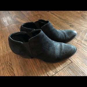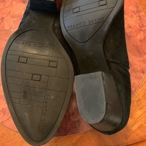 Black suede booties-2 inch heel—rubber sole. They are marked a 6.5 but run big.I am a size 7 and they fit perfect.