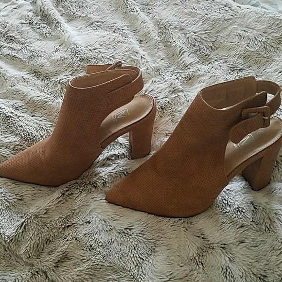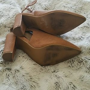Camel colored booties with ankle strap. Worn a few times, still good condition.