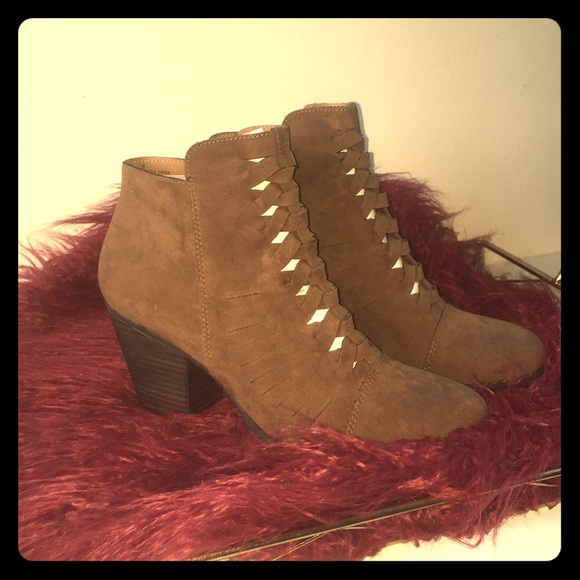 2" heel booties. Size 9. Never worn still with cardboard and ties!