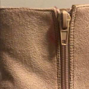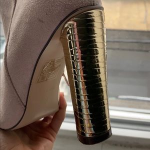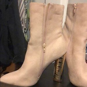 Worn twice! Gold heel, classy booties for a night out or a day in the office ! Smoke free household has a small very minimum pink stain by the zipper ! Picture attached