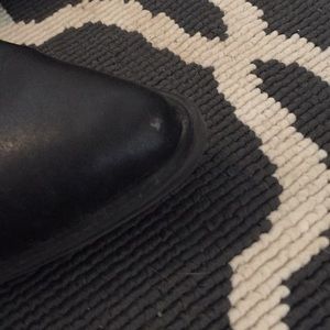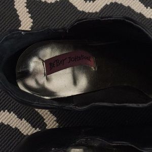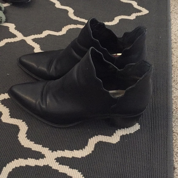 Black scalloped edge Betsy Johnson booties. The heel lining is coming up slightly and there is one small scuff on the toe.