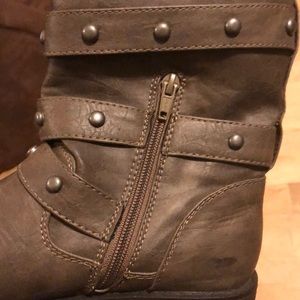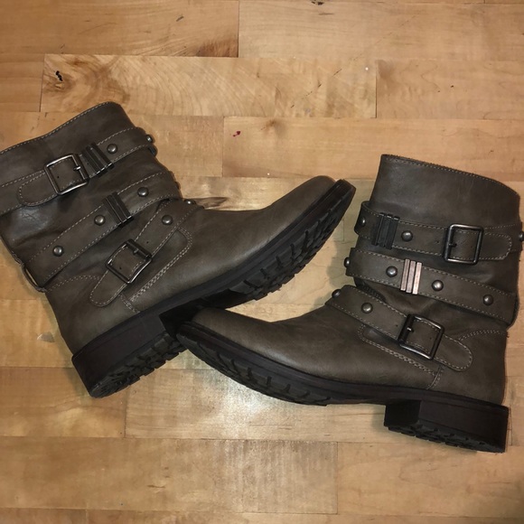 These booties are a grey/ greenish color with metal details. Only worn maybe twice. Super cute
