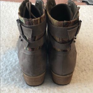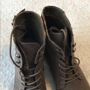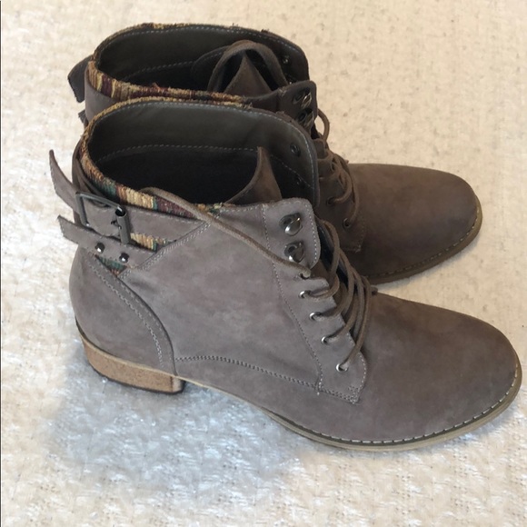 These booties are so cute, there is a pattern near the ankle and a little bit of a heel. It is a size 9 but I thought they fit a little snug-I am usually a 9.5 though so that could be why. The suede material is a greyish brown tone. Let me know if you have questions! (Never been worn)