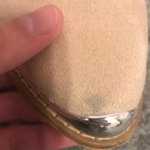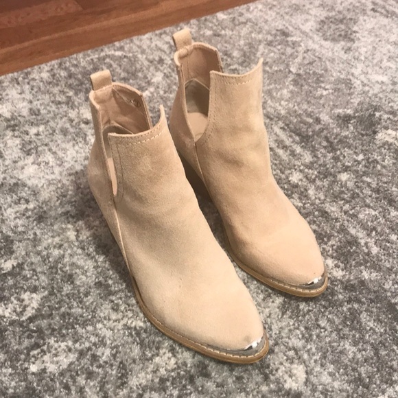 Creme colored suede booties. The only mark is on the right toe (very small) showed in photos. Size 7 but runs a little big. Usually I’m a size 7 1/2.