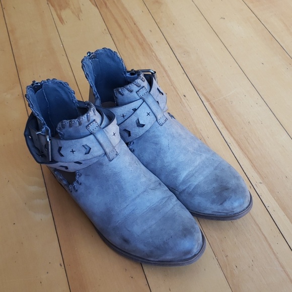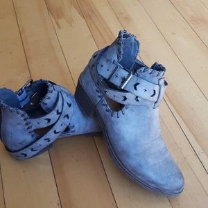 Grey booties with a wrap buckle. Only worm a few times slight wear on the toe, see pictures above.
