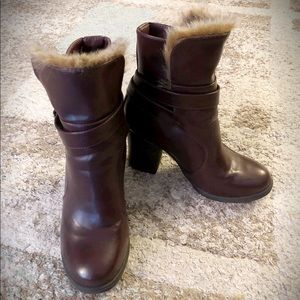 Stylish never worn before chocolate brown winter booties. Accompanied by a chic belt, chunky heel and faux fur makes these booties perfect for any occasion!