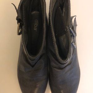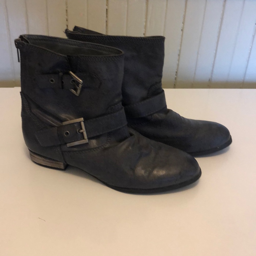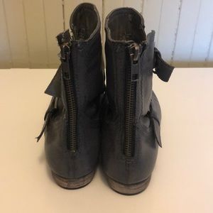 Grey short buckle boots with back zipper. Man made materials. Tried on, never worn.
