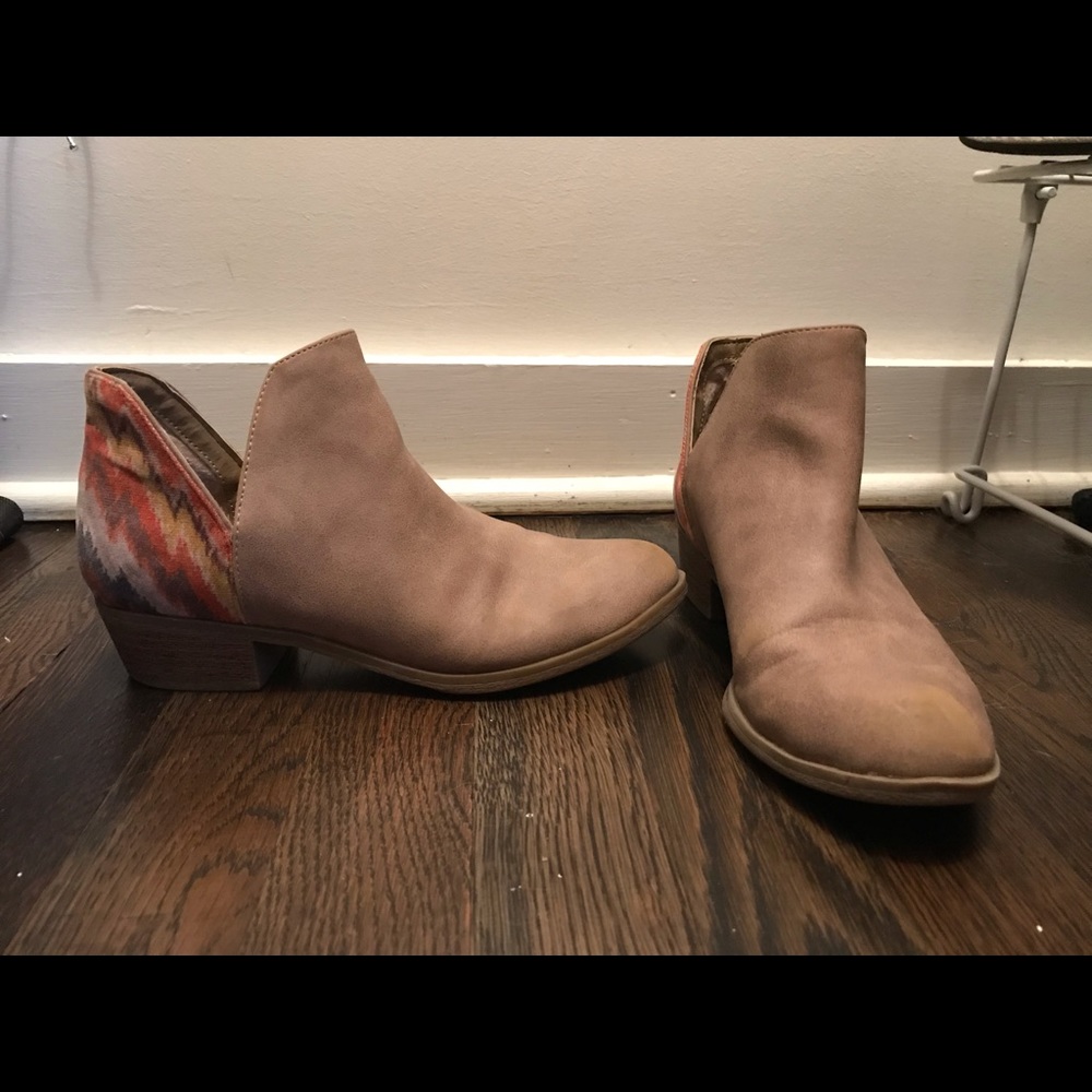 Indigo rd brand booties. Camel with Aztec design. Lightly worn. They are super comfy and look great with jeans or with a dress/skirt.
