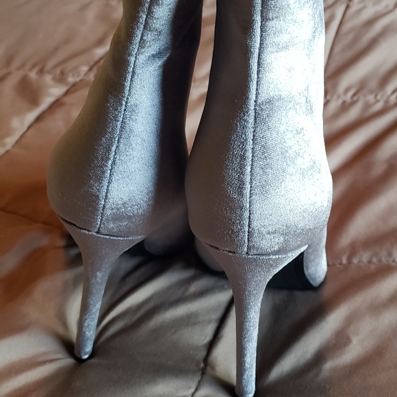 Grey, velvety material. Never worn and still in the original box. Make offer!