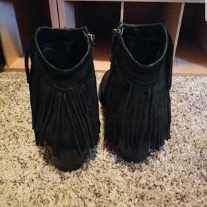 These booties are black Suede. They have been worn but there are no flaws. The only signs of wear is on the bottom. Very comfortable. Heel height is great!