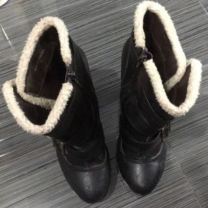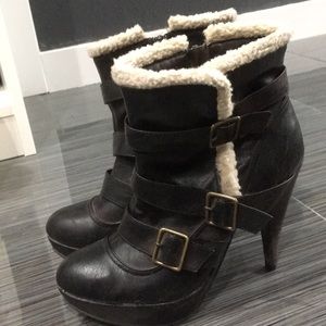 Dark leather above the ankle booties, stiletto heel, buckle straps and zip up from side