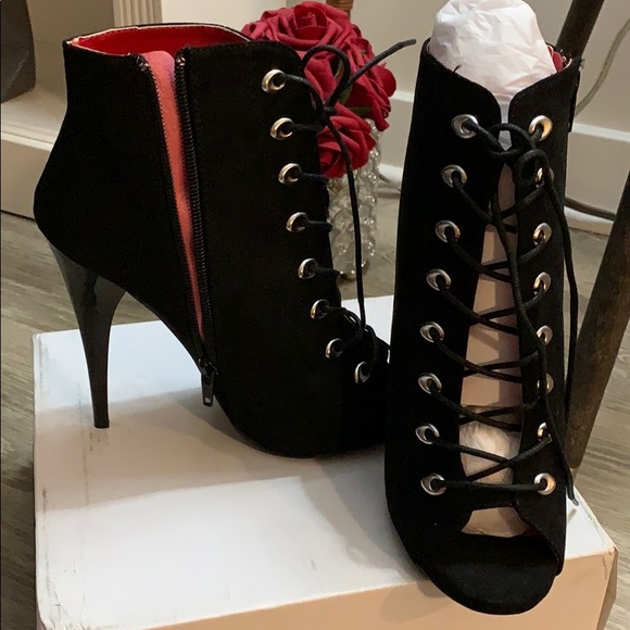 Black lace up ankle boots with red lining inside shoe. Brand new, never worn. Great for fall season with jeans and a leather jacket.