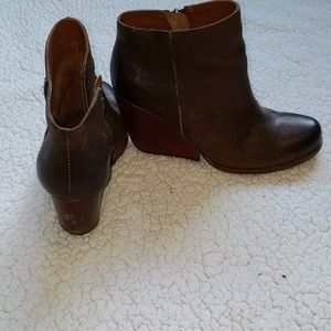 Brown leather wedge booties great for fall! Zipper on the inside of bothered shoe with a very thick wedge heel. They are very comfortable and have slight scuffs on the back (pictured)
