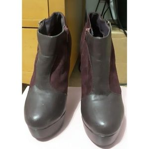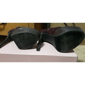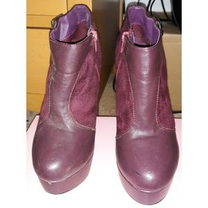 Eggplant colored high heel booties. Have been worn but are still in decent shape. Does have creases in the front. They are a size 7 but fit like a size 6 (which is my shoe size.) Very comfy.