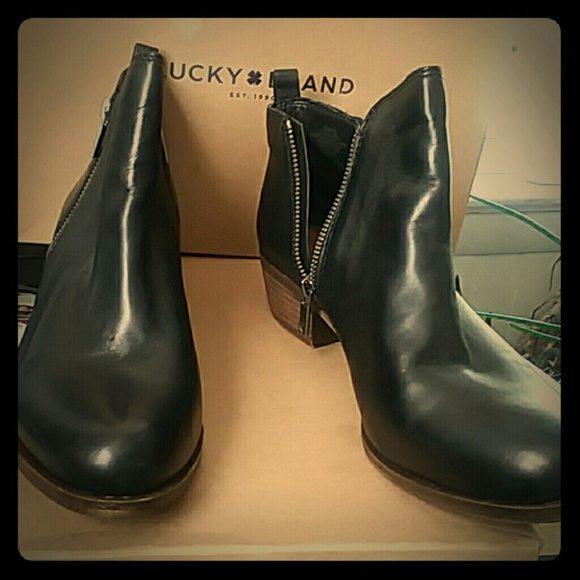 Black leather booties, side zip. Soft. Very, very minor imperfection on front of right bootie. Never worn. Too tight.