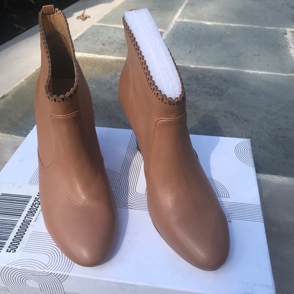 Tan leather booties with scalloped detail