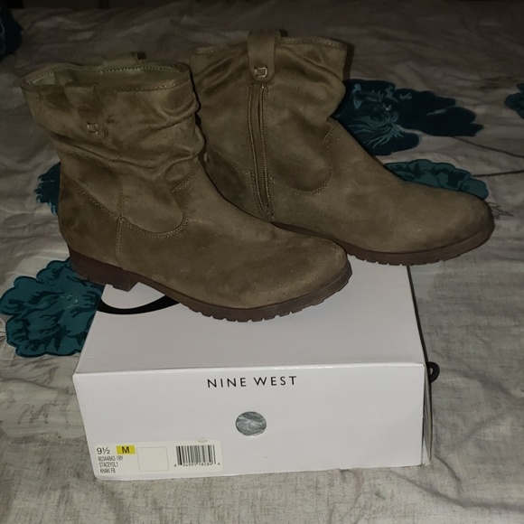 Nine West suede boot. Practically new worn once or twice. Nice everyday boot or dress them up. Olive green there is a burgandy accent on the heel.