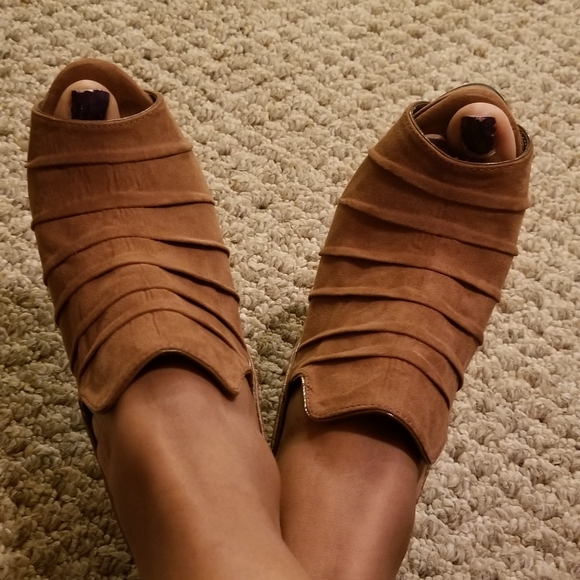 NWB Brown open toe booties faux suede leather. Great for any time of the year. Small platform 4.5 inch heel. New with box.