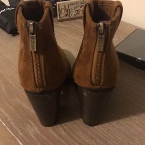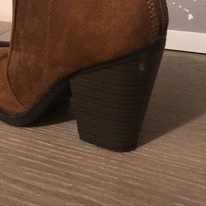 Tan booties worn a few times. Small scuffs on the heel as pictured.