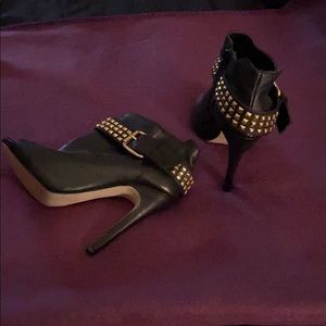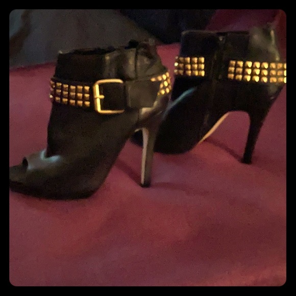 High heel open toe bootie with a studded gold belt. This is a beautiful shoe never worn outside, and well kept