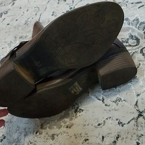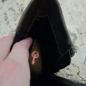 About 1-1.5 inch heel. zipper on one side and stretchy band on other for easy insert. Slightly used but in great condition and no signs of wear other than on bottoms of booties