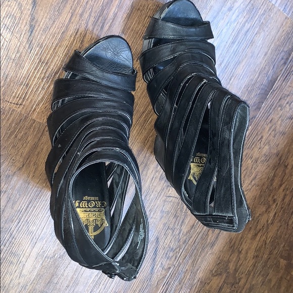 Black strapped booties with low heel and zip up at the back. Slight wedges
